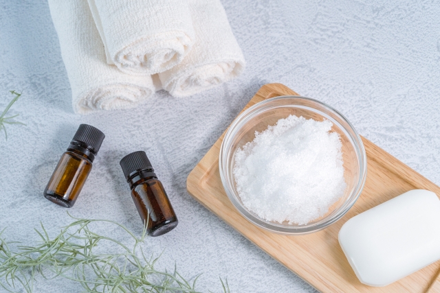 塩を使う場合は大さじ1〜2杯程度を目安にしてください。エプソムソルトなどマグネシウムを含むバスソルトは筋肉の緊張をほぐす作用もあるため、疲労回復にも効果的です。