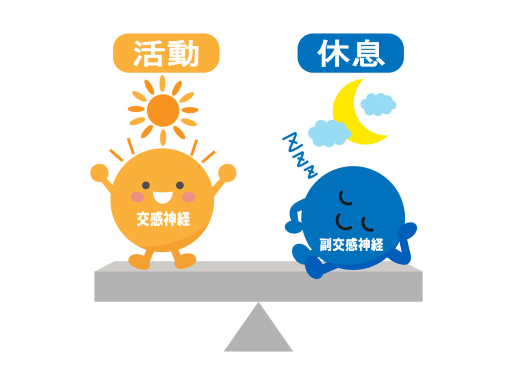 自律神経は交感神経と副交感神経の2つから成り立っていて、この2つがバランスよく働くことで心臓の動きもコントロールされています。交感神経が優位になると心拍数が上がり、副交感神経が優位になると心拍数が下がるという仕組みです。