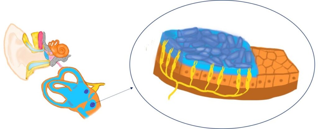 内耳には「耳石器」という平衡感覚をつかさどる器官があります。ここにある小さな石(耳石)が、何らかの原因で剥がれ落ちて三半規管の中に迷い込んでしまうと、頭を動かすたびに強いめまいが起こります。これが良性発作性頭位めまい症です。