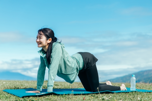 次に息を吐きながら背中を丸めて、おへそを覗き込むように頭を下げていきます。背骨を一つ一つ動かすような意識で、ゆっくりと丁寧に行うことが大切です。この動きを5回から10回繰り返すことで、背骨の柔軟性が高まり、自律神経の働きが整いやすくなります。朝起きた時に行うと、一日のスタートを快適に切ることができますよ。