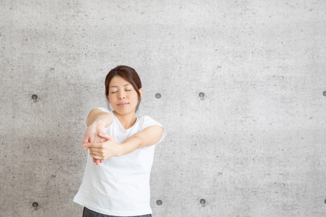 パソコン作業やスマートフォンの操作で酷使される前腕は、意外と緊張が蓄積している部分です。右腕を前に伸ばし、手のひらを上に向けた状態で、左手で右手の指先を手前に引き寄せます。前腕の内側がじんわりと伸びるのを感じながら15秒ほどキープします。