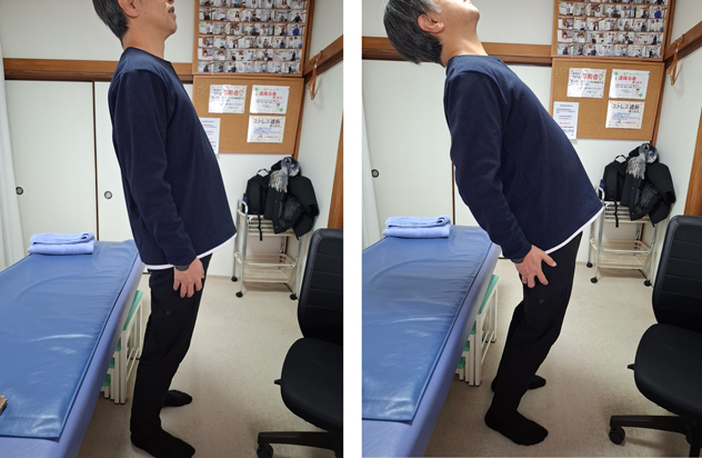 来院時は、座位が10分継続すると腰の痛みが増し椅子に座っていることが出来ない。座位から立位になる際の激痛と、立位になった際背中が伸ばせない状態であった。