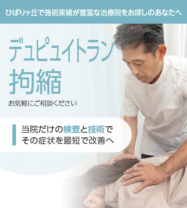 病院やほかの治療院で改善しなかったとしても諦める必要はありません。デュピュイトラン拘縮は豊富な施術実績を誇る当院にお任せください。