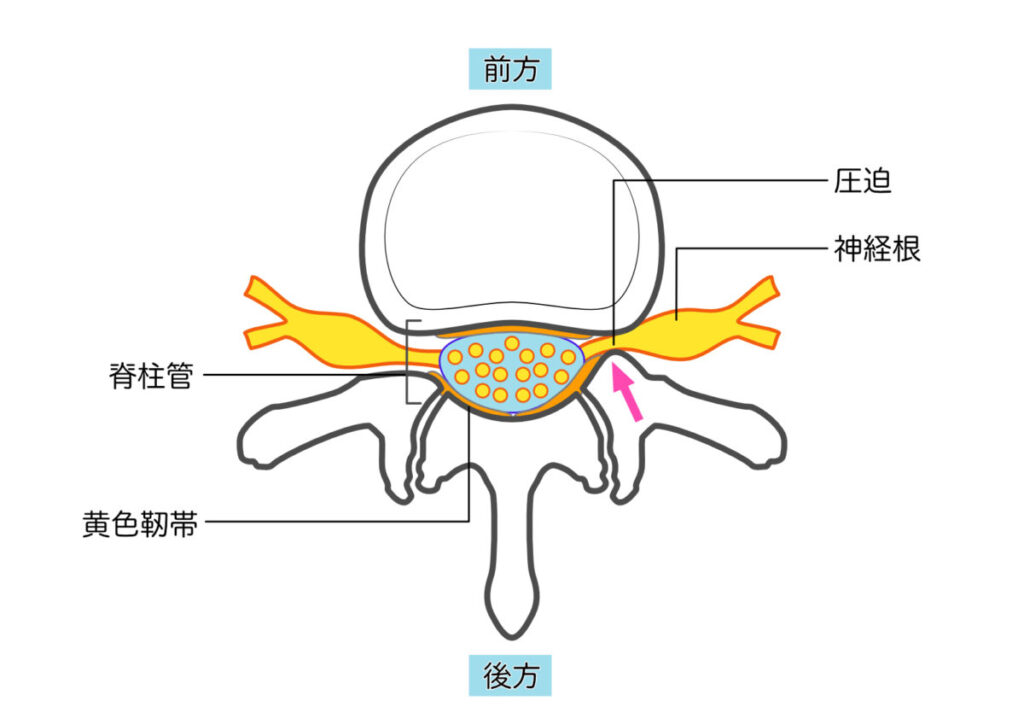 背骨の中を通る脊柱管が、椎間板の変性や靭帯の肥厚、骨の変形などにより狭くなります。その結果、神経が圧迫されて痛みやしびれが生じます。レントゲンやMRIで骨の変形や脊柱管の狭窄が確認できることが多いです。